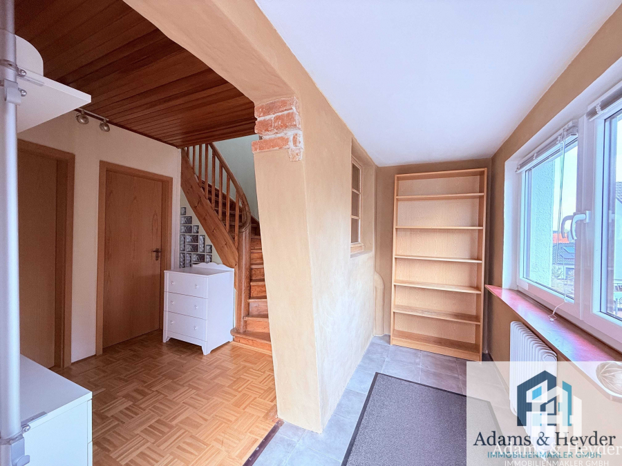 Über eine kleine Treppe betreten Sie den großzügigen Eingangsbereich, von dem es in das Erdgeschoss und über die schöne Holztreppe ins Obergeschoss geht.