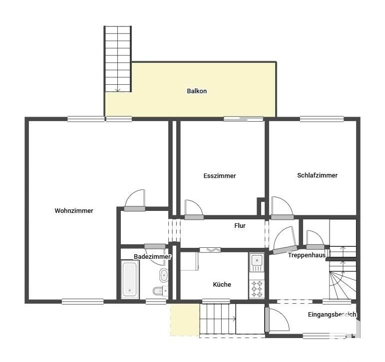 Im Erdgeschoss befindet sich das geräumige Wohnzimmer, ein separates Esszimmer, von dem Sie auf den hochwertigen Balkon kommen sowie ein Schlafzimmer. Küche und Badezimmer runden das EG ab.