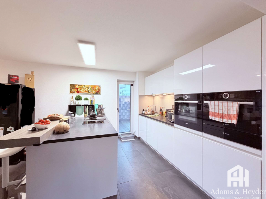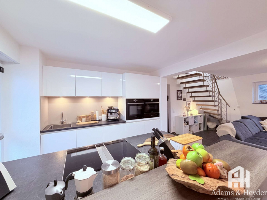 Über den ebenerdigen (und damit auch altersgerechten) Zugang über das Treppenhaus kommen Sie in den großzügig und offen gestalteten Wohn-, Ess- und Küchenbereich, der das Herzstück der Wohnung bildet. Große Fensterflächen sorgen für viel Tageslicht und schaffen eine helle, einladende Atmosphäre. Der vorhandene Holzofen sorgt zusätzlich zur Fußbodenheizung für eine behagliche Wärme.