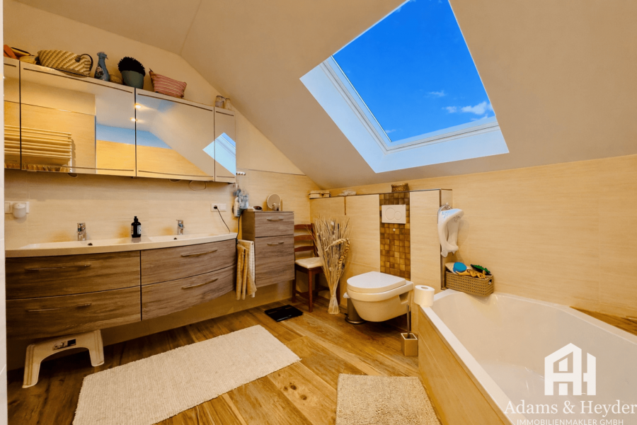 Die Wohnung erstreckt sich über 2 Etagen und präsentiert sich in gehobener Ausstattung. Hochwertige Fliesen und elegantes Parkett sorgen für eine warme und einladende Atmosphäre.
