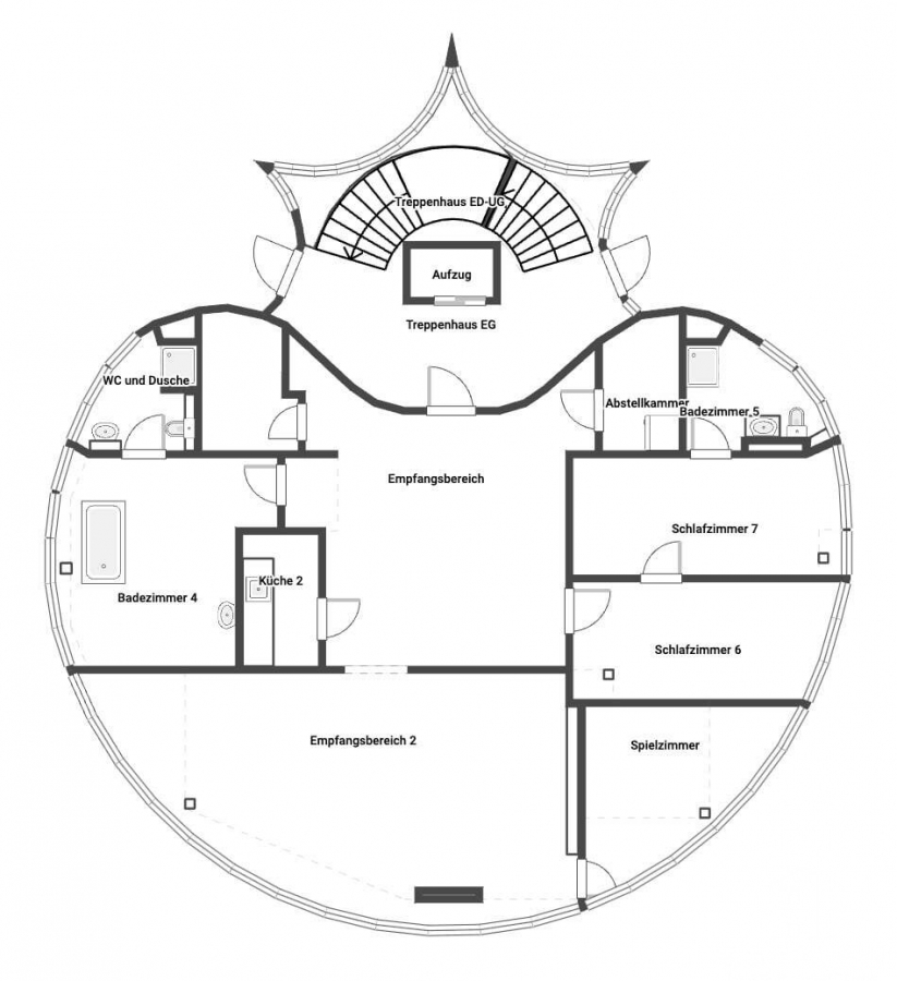 Das Erdgeschoss bietet einen Empfangsbereich, ein Wohn- & Esszimmer, drei Schlafzimmer, drei Bäder, 2 Abstellräume und eine kleine Küche.