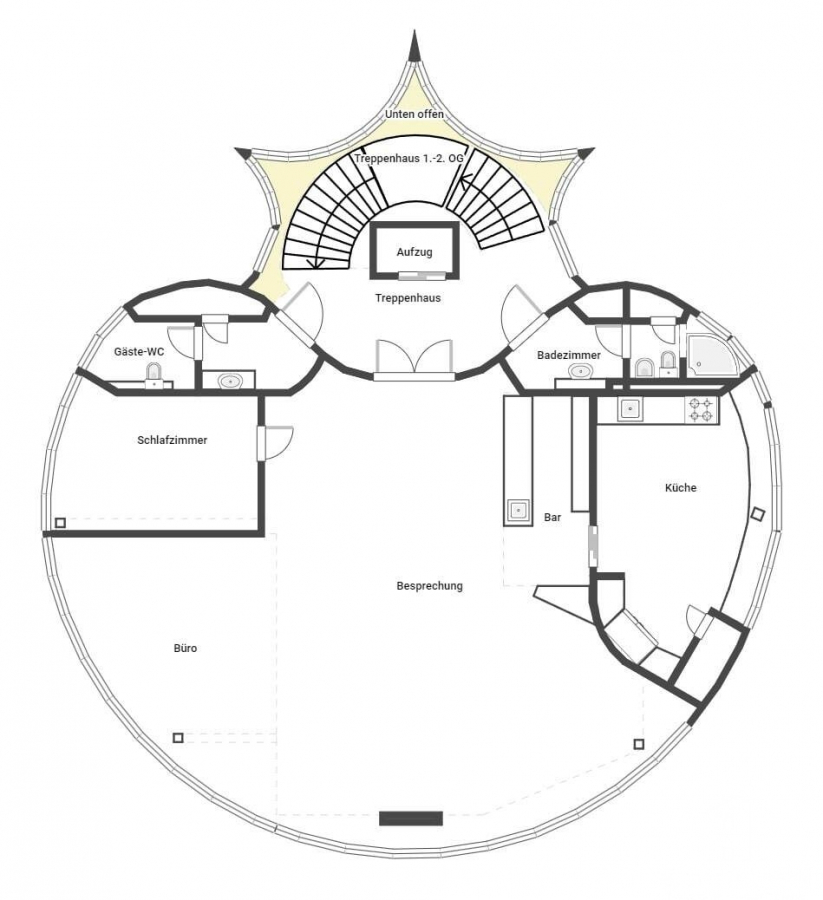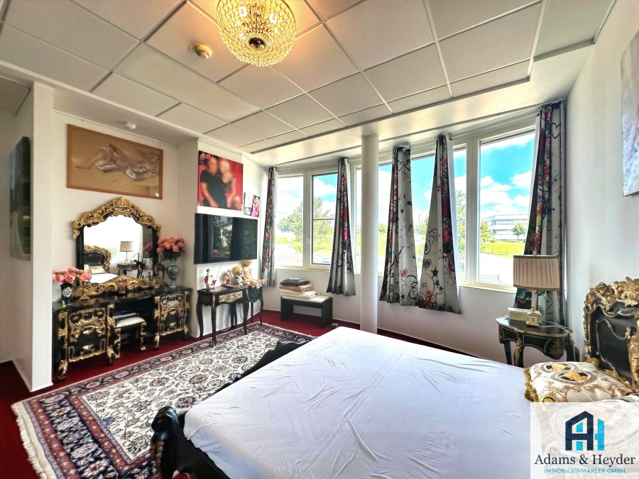 Das zweite Obergeschoss wartet mit einem riesigen Büro auf, welches mit einer Theke und einem schwebendem Holz-Kamin ausgestattet ist. Angrenzend sind die hochwertige Küche, ein Schlafzimmer, ein Badezimmer, ein WC und zwei Abstellräume.