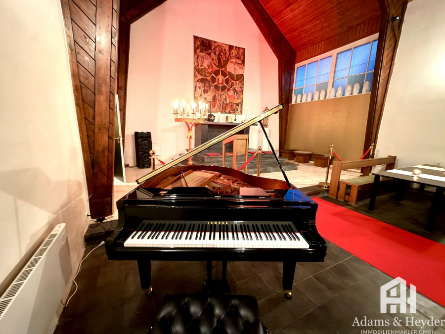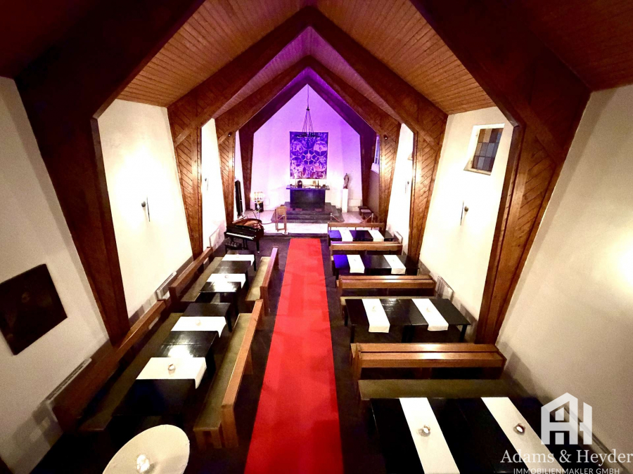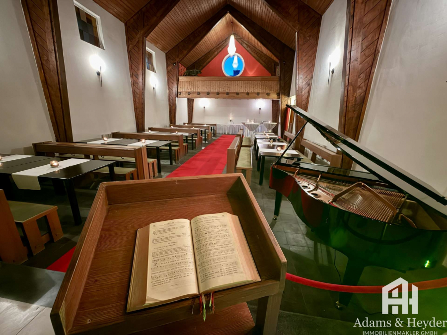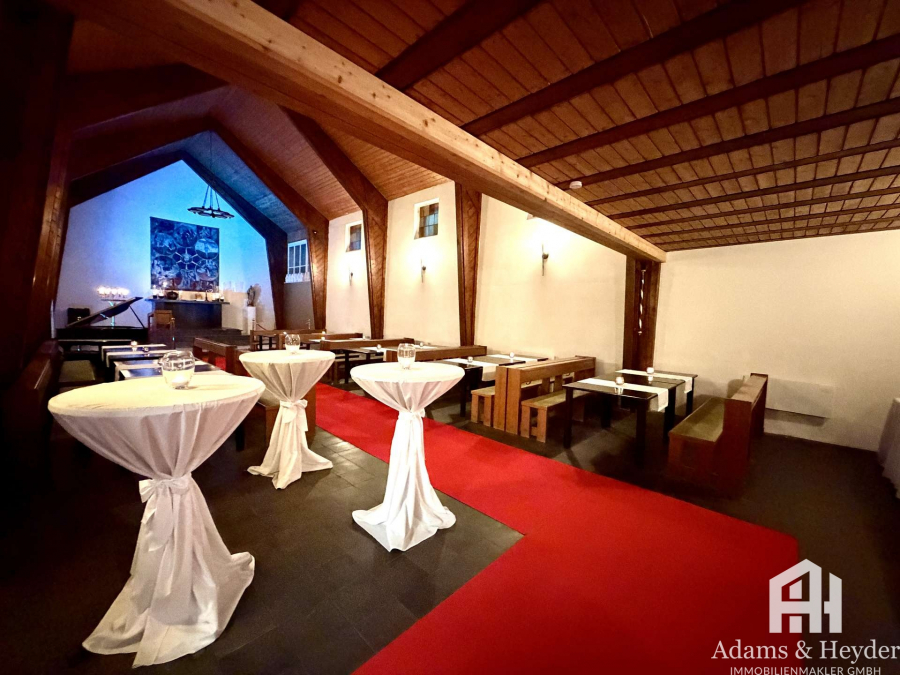 Die Eventlocation ist mit viel Liebe zum Detail und unter Einsatz sehr hochwertiger Materialien zu einer ausgewogenen Mischung aus Kirchenhistorie und moderner, luxuriöser Eleganz hergerichtet worden. Sie bietet neben dem Kirchensaal samt Altar eine Empore mit Lounge und Zugang zum ehemaligen Glockenturm, eine Profiküche, eine voll ausgestattete Bar sowie Garderobe und getrennte, moderne sanitäre Anlagen.