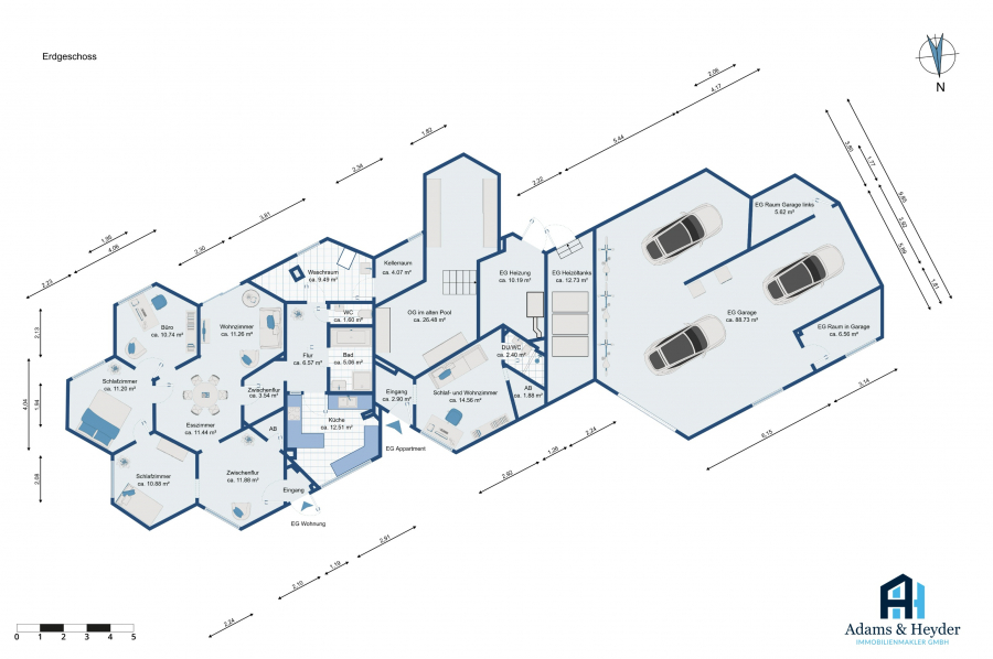 Zusätzlich stehen umfangreiche Nutzflächen zur Verfügung, darunter eine sehr große Garage, weitere Stellplätze im Hof, Keller- und Abstellräume.