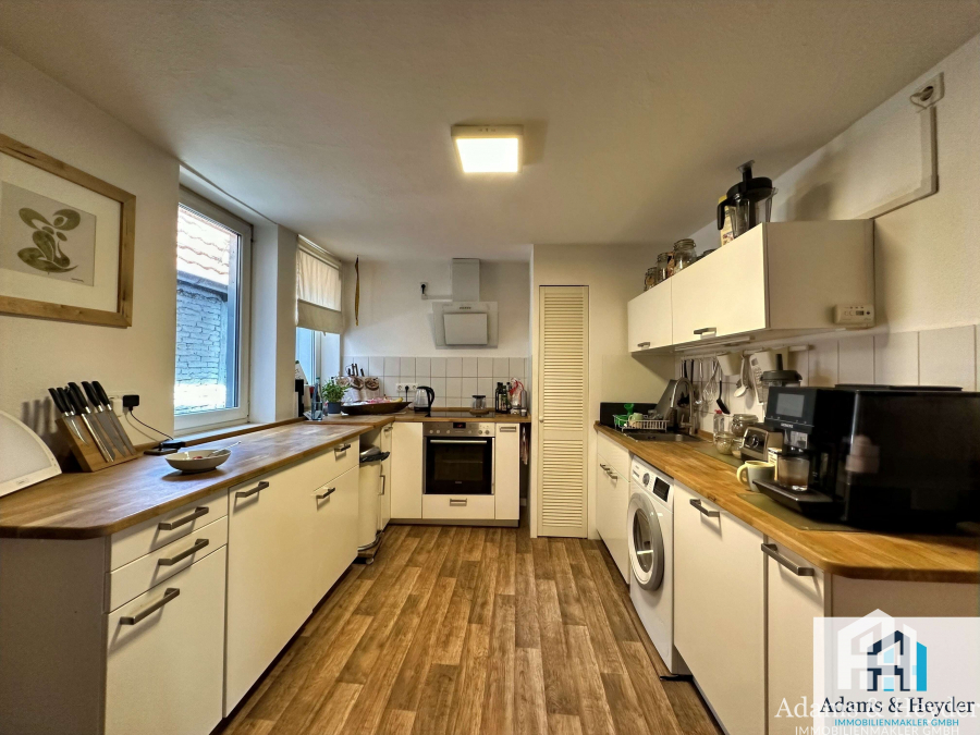 Das direkt angrenzende Einfamilienhaus dahinter bietet mit drei Zimmern 73 m² Wohnfläche, eine Ausbaureserve des kompletten 2. Obergeschosses (ca. 40 m²) und einen kleinen Vorhof.