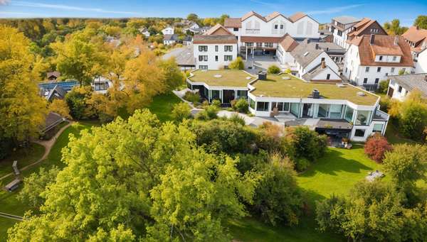 Zusätzlich stehen umfangreiche Nutzflächen zur Verfügung, darunter eine sehr große Garage, weitere Stellplätze im Hof, Keller- und Abstellräume.