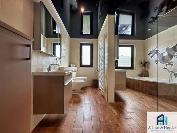 Das Erdgeschoss bietet einen großen Flur, zwei Schlafzimmer, ein sehr großzügiges Badezimmer mit 2 Waschtischen, 1 WC, 1 Bidet, Dusche & Eckwanne, einen Wohn- & Essbereich mit Kachelofen, eine hochwertige, offene Küche mit neuwertiger Einbauküche samt Miele Elektrogeräte und direktem Zugang zum großen Wintergarten und der Terrasse mit Grillkamin.