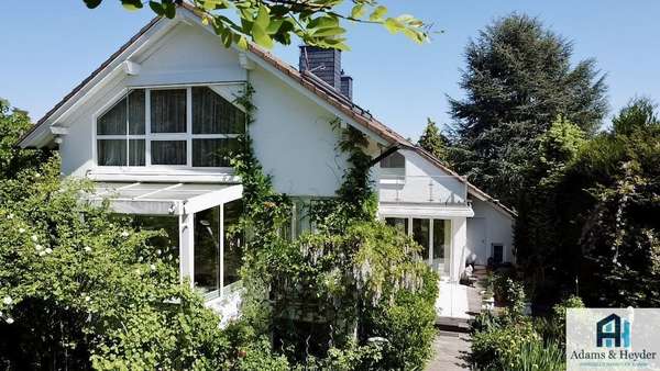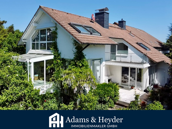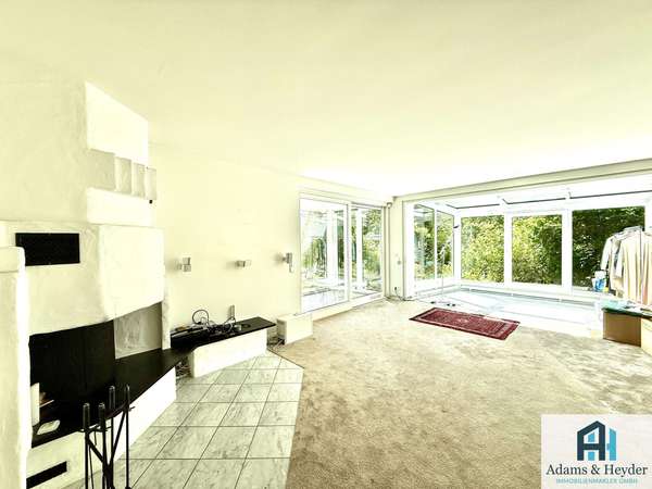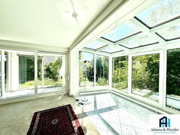Der großzügige Wohnbereich besticht durch große, bodentiefe Fensterfronten, die für eine helle und freundliche Atmosphäre sorgen und gleichzeitig den Blick in den blickgeschützten Garten freigeben. Zwei lichtdurchflutete Wintergärten erweitern den Wohnraum und laden dazu ein, die Natur bei jeder Witterung zu genießen.