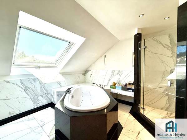 Im oberen Bereich des Hauses erwartet Sie ein luxuriöses Masterbad mit Whirlpool-Badewanne, großzügiger, ebenerdiger Dusche und separatem WC – ausgestattet mit Marmor und anderen hochwertigen Materialien für höchsten Komfort. Angrenzend daran liegt die Ankleide mit Spiegelfronten, die direkt in das geräumige Schlafzimmer führt. Dank der bodentiefen Fenster mit elektrischen Jalousien genießen Sie auch vom Bett aus einen ungestörten Blick ins Grüne.