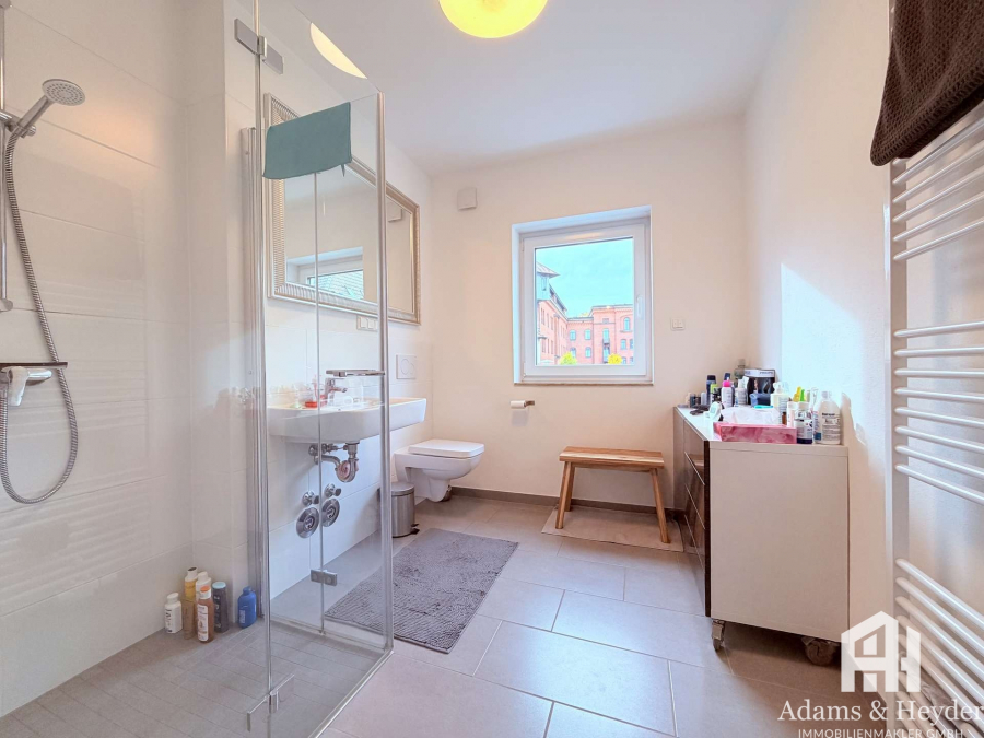 Ein großes Badezimmer mit ebenerdiger Dusche & Fenster rundet diese hochwertige Wohnung ab.
